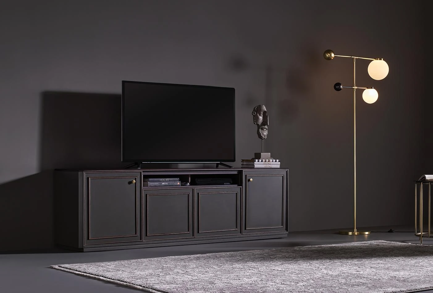 میز تلویزیون Riga انتقال رنگ آرام و اصیل با ترکیب فلز، طرحی غنی همراه با جزئیات و ظاهر چرمی فضای پ ...