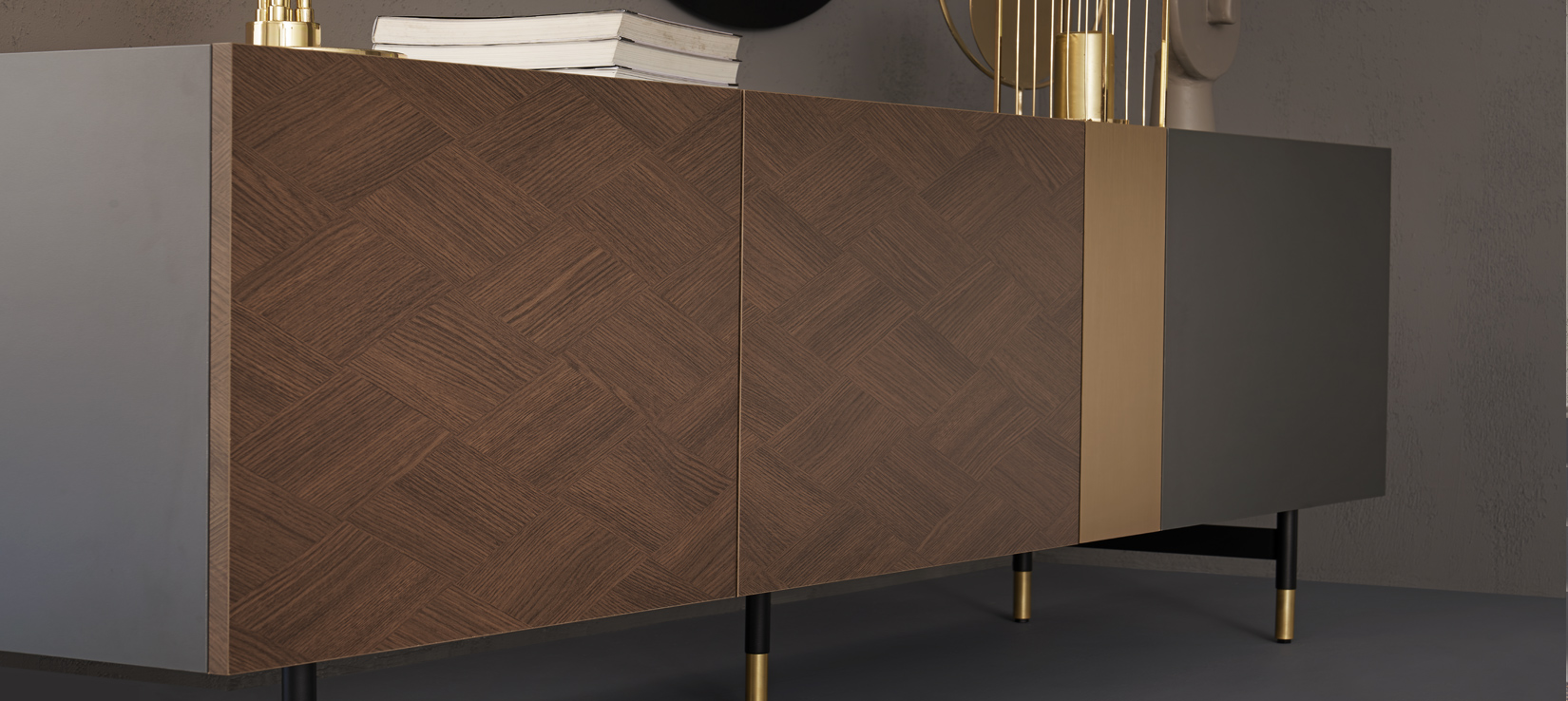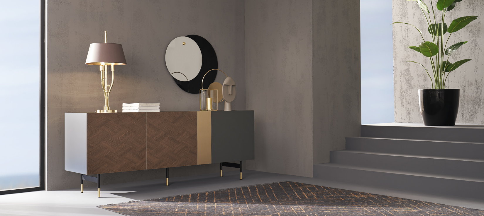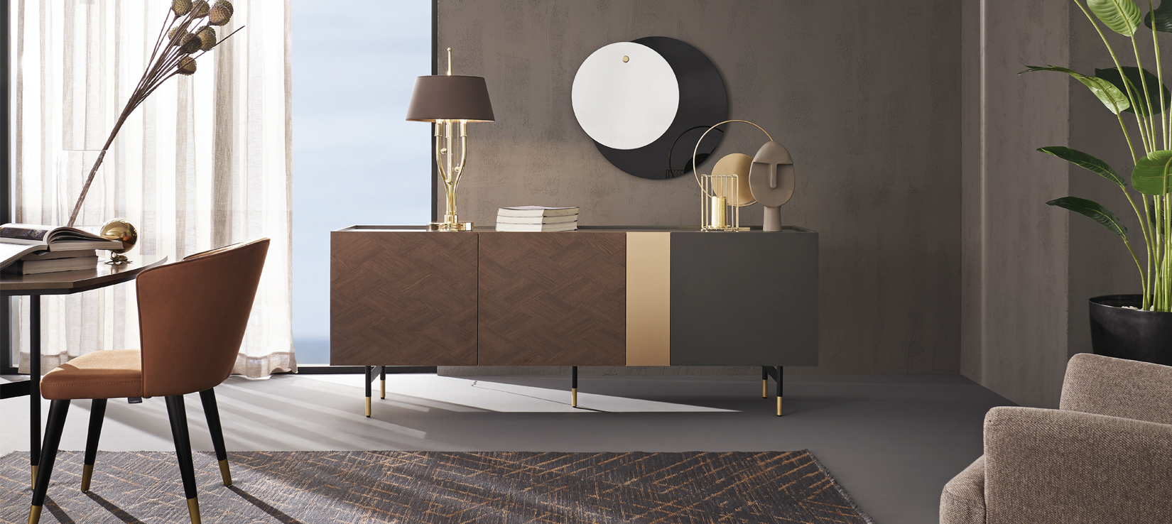 سرویس غذاخوری DORIAN با طراحی خاص و صندلی ها با پایه های طلایی رنگ به همراه دو مدل میز ثابت و متحرک، فضایی مدرن و خیره کننده ایجاد می کند. همچنین بوفه این سرویس ترکیبی از چوب و فلز با ظاهر پارکت خاص در ترکیب رنگی طلایی و خاکستری مات بازتاب طراحی مدرن در فضای شما خواهد بود.