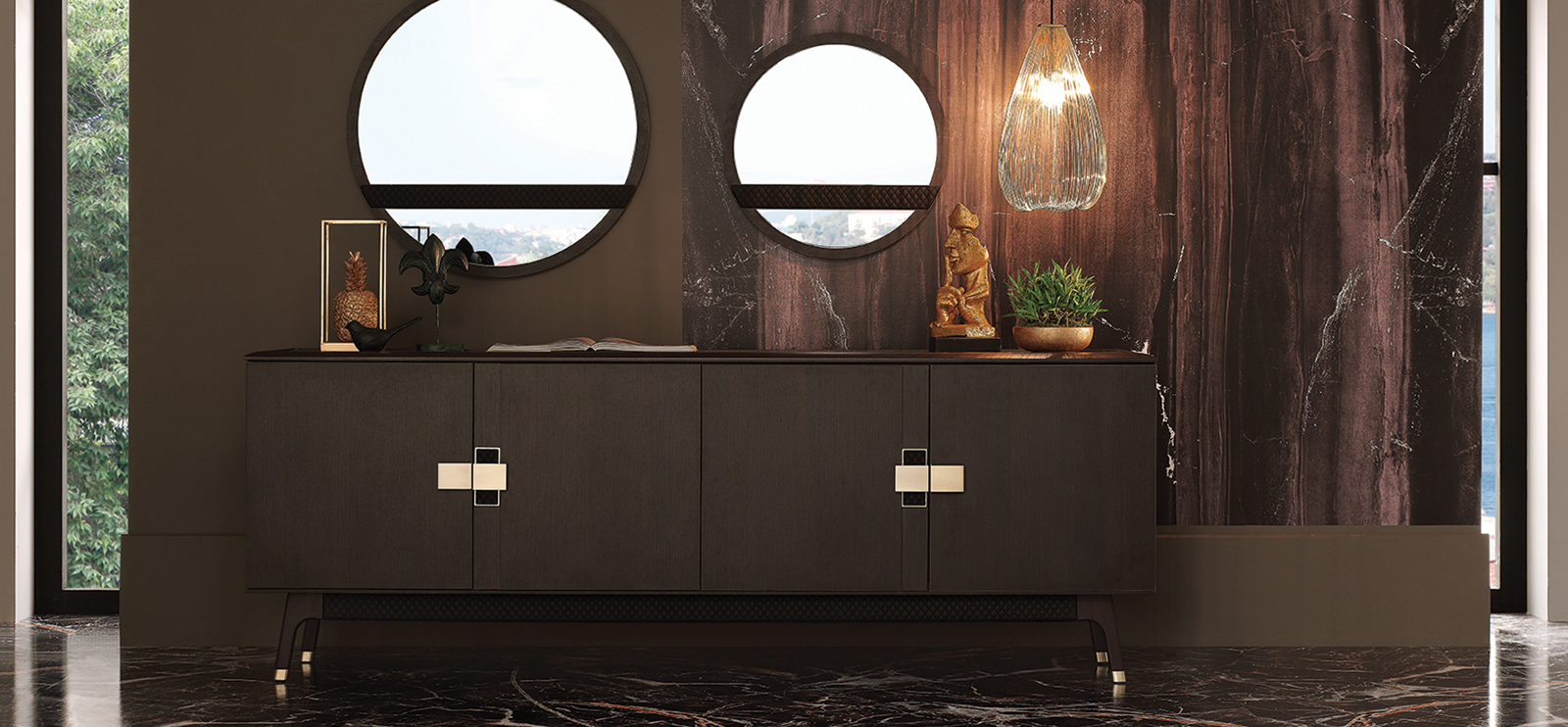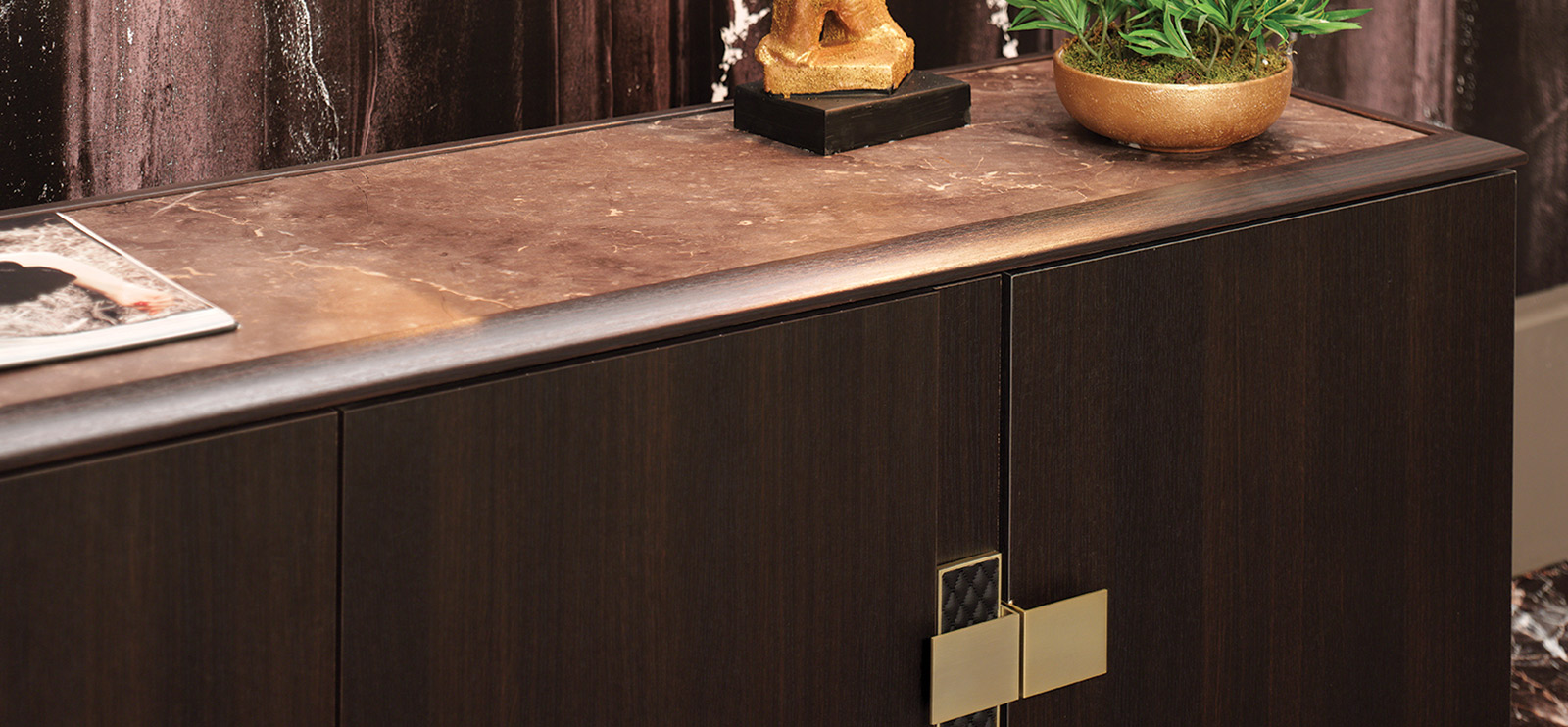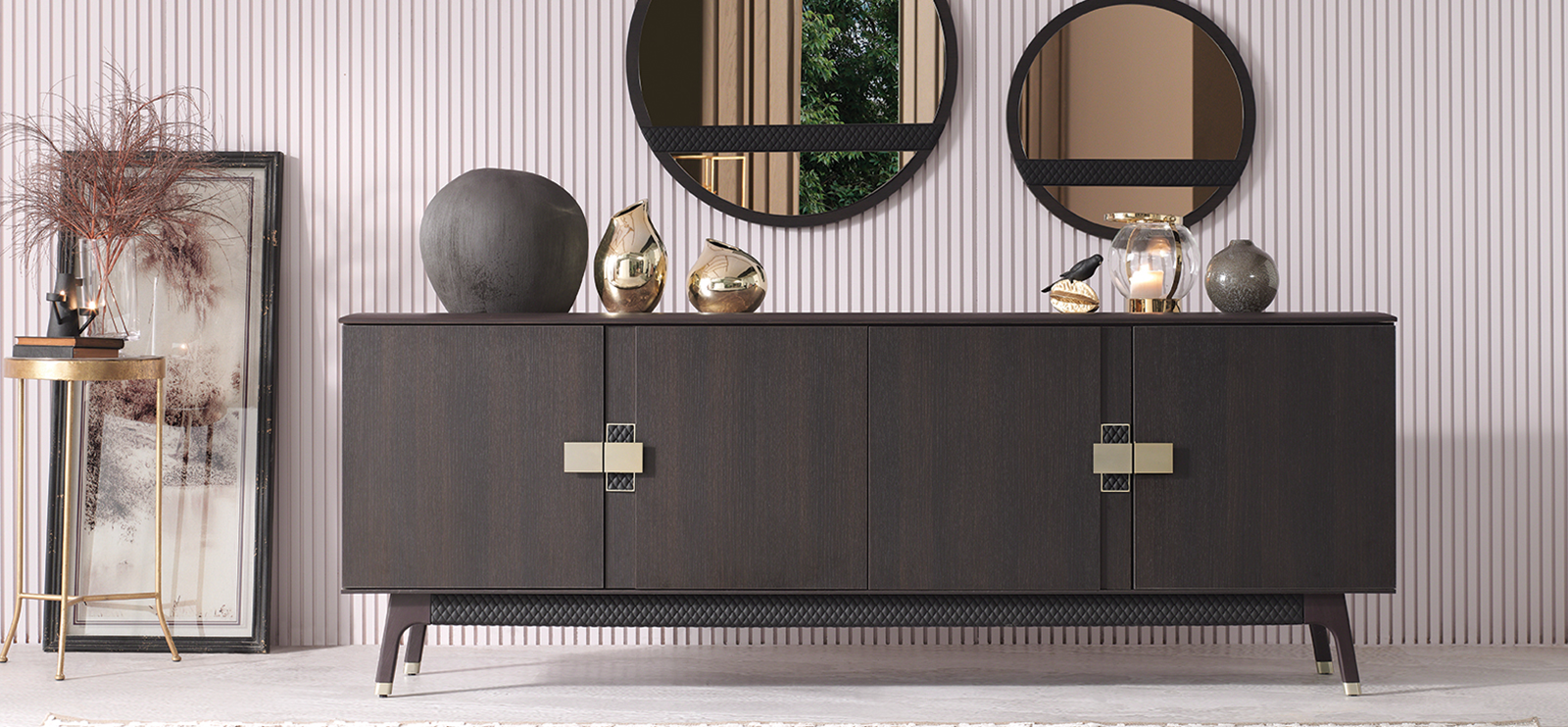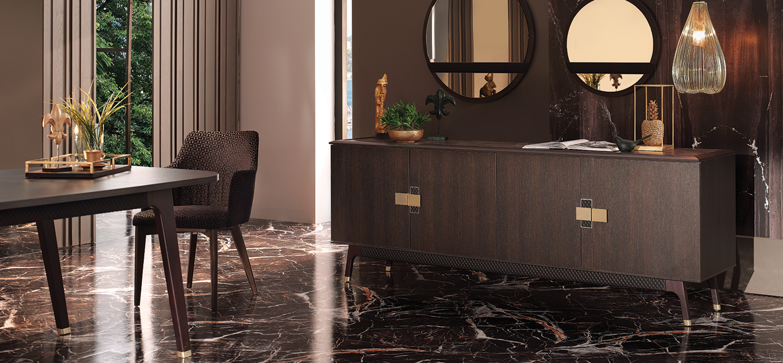 ست اتاق غذاخوری مدل NAVONA با ارائه غنای بصری توسط انتخاب جزئیات دستگیرهی طلای پاتینا با همراه با رنگ گردویی تیره و با كاربرد ظاهری مرمر بر روی سطح كنسول، شیکی خاصی به طراحی خود میبخشد.