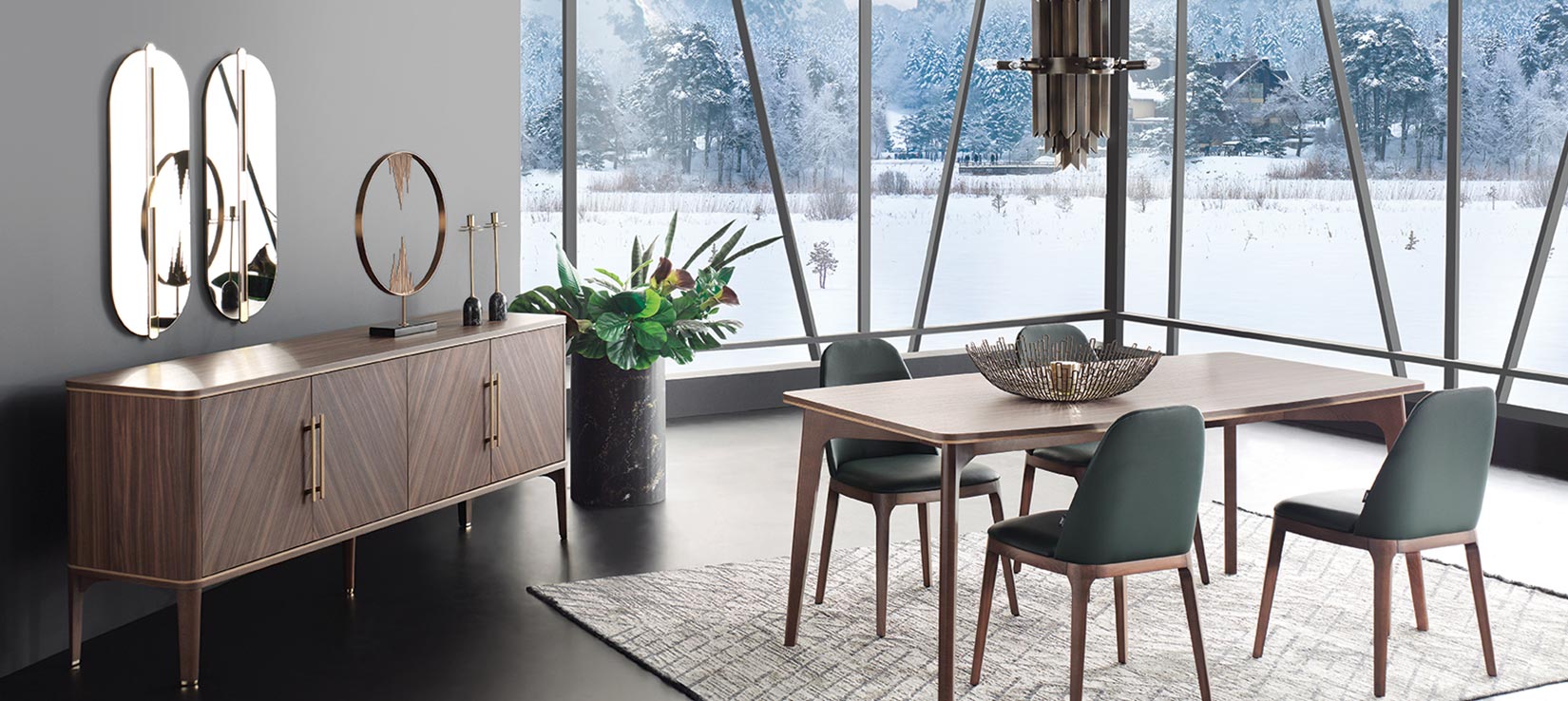 ست اتاق غذاخوریRAUM مفهوم دکوراسیون معاصر را با جزئیات چشمگیر ترکیب میکند و خط طراحی مدرن را با زیبایی بی انتهای چوب کنار هم میآورد. در حالی که سطوح رنگی گردویی طبیعی که با استفاده از الگوی زاویه دار جلوه میکنند، زیبایی منحصر به فردی به طراحی بخشیدهاند، کاربرد لبهی انتهایی ویژهی انزا توجهها را به کارِ دستی بی نظیر این سری جلب میکند. دستگیرههای فلزی رنگ طلایی و کاربرد پایههای چوبی ظرافت چشم نوازی را به انتقال فرمهای گرد اضافه میکند.