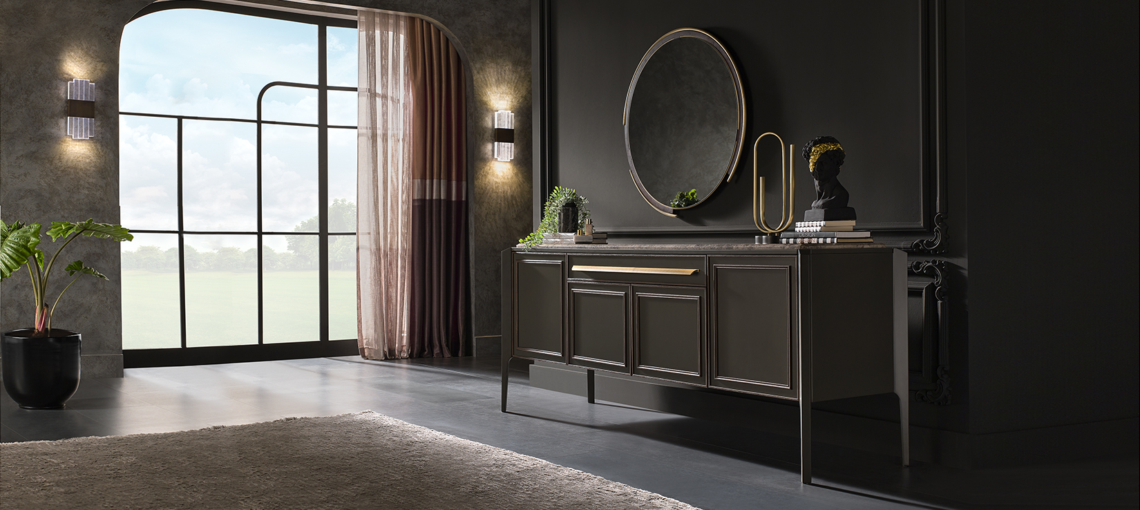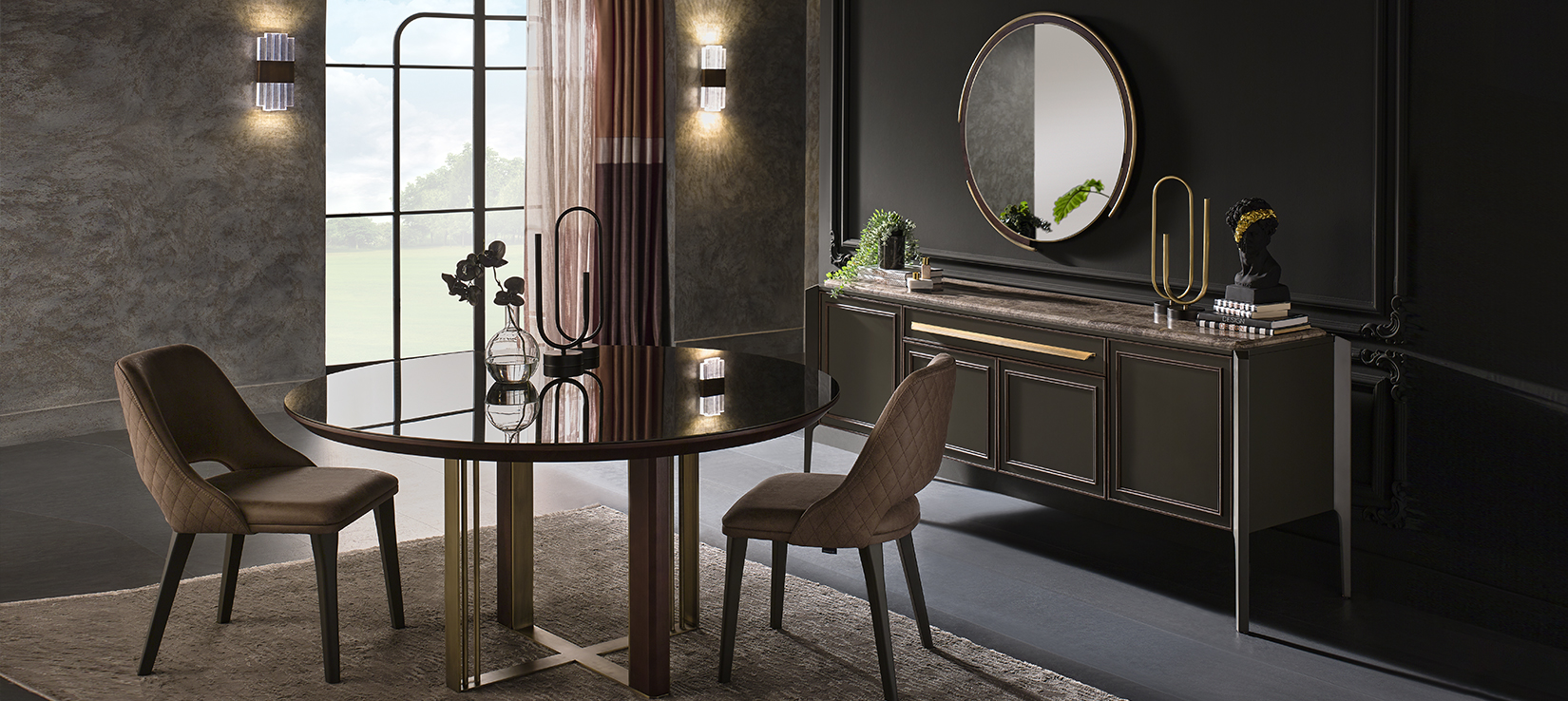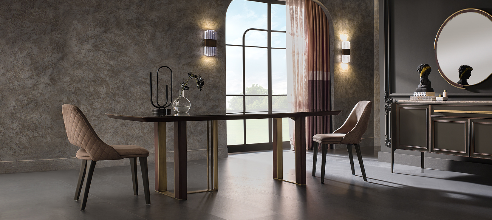 سرویس ناهارخوری SIRONA با ترکیب رنگ ذغالی و گردویی و متریال های چوب و فلز و رویه ی 100 درصد سنگ بوفه در 3 مدل مختلف میز غذاخوری، زیبایی و کاربرد را ترکیب کرده و فضایی کلاسیک و چمشگیر ایجاد می کند.