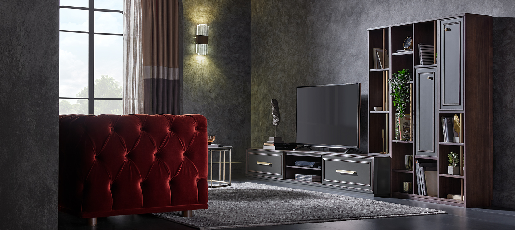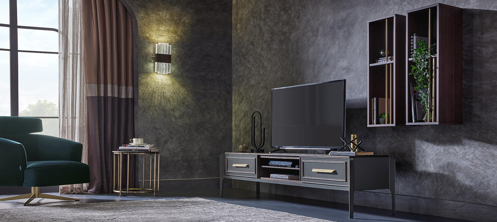 میز تلویزیون SIRONA با طرای اصیل و ترکیب رنگ گردویی و ذغالی، فضایی لوکس و شیک ایجاد می کند.