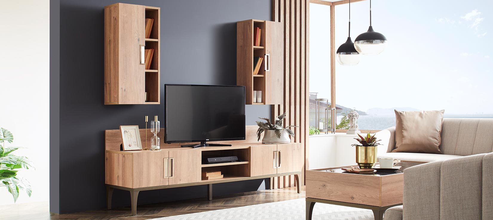 ست تلویزیونSONA با ترکیبی از رنگهای گردویی کمرنگ و قهوهای متالیک با طراحی خاص دستگیرههای برنزی ویژهی این سری، توجهها را به سبک مدرن و شیک خود جلب میکند. این مدل علاوه بر ارائهی دو گزینه میز تلویزیون در اندازههای متفاوت با قفسههای باز و کمدهای درب داری که فضای ذخیره سازی اضافی در اختیار شما قرار میدهند، طراحی خود را با ماژولهای کاربردی غنی میکند.
