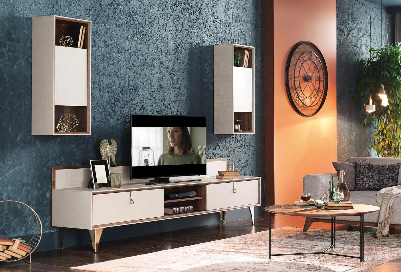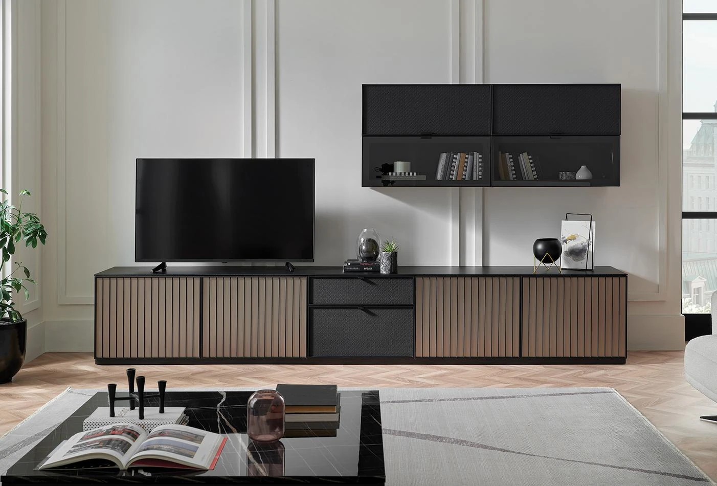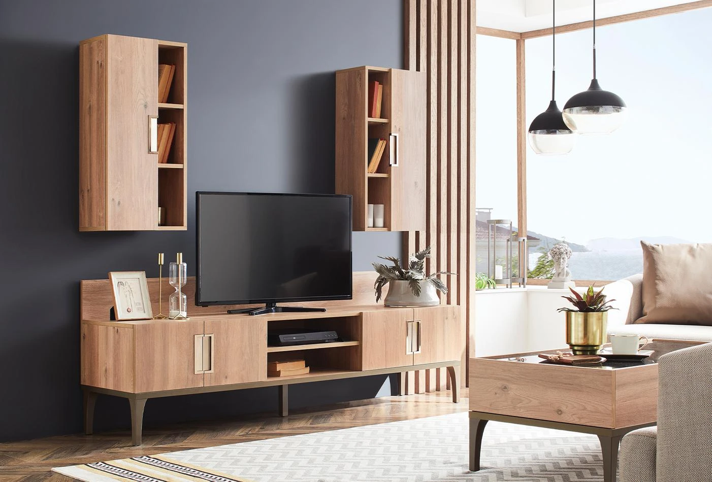 ست تلویزیونSONA با ترکیبی از رنگ‌های گردویی کمرنگ و قهوه‌ای متالیک با طراحی خاص دستگیره‌های برنزی و ...
