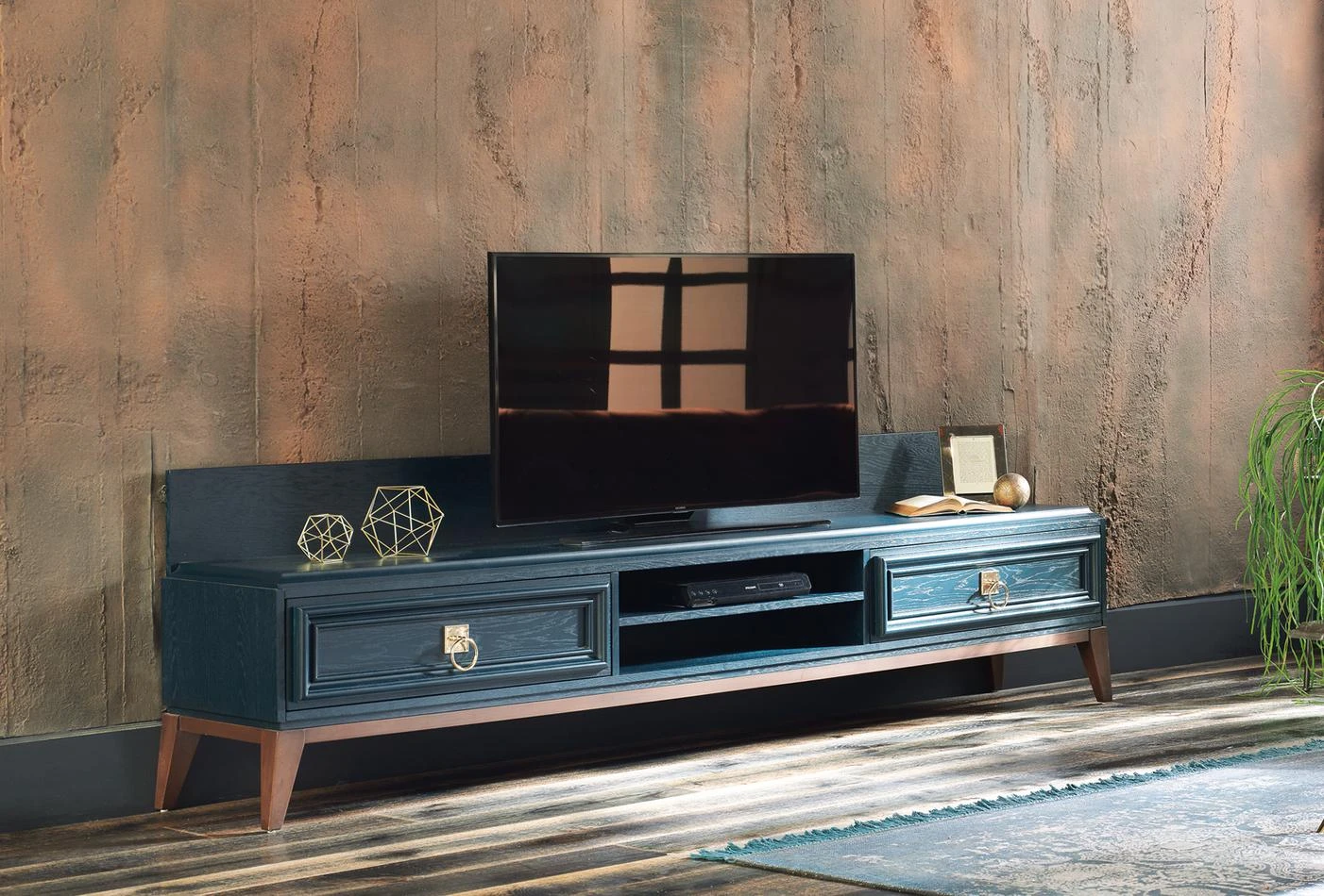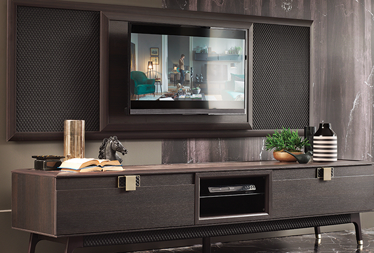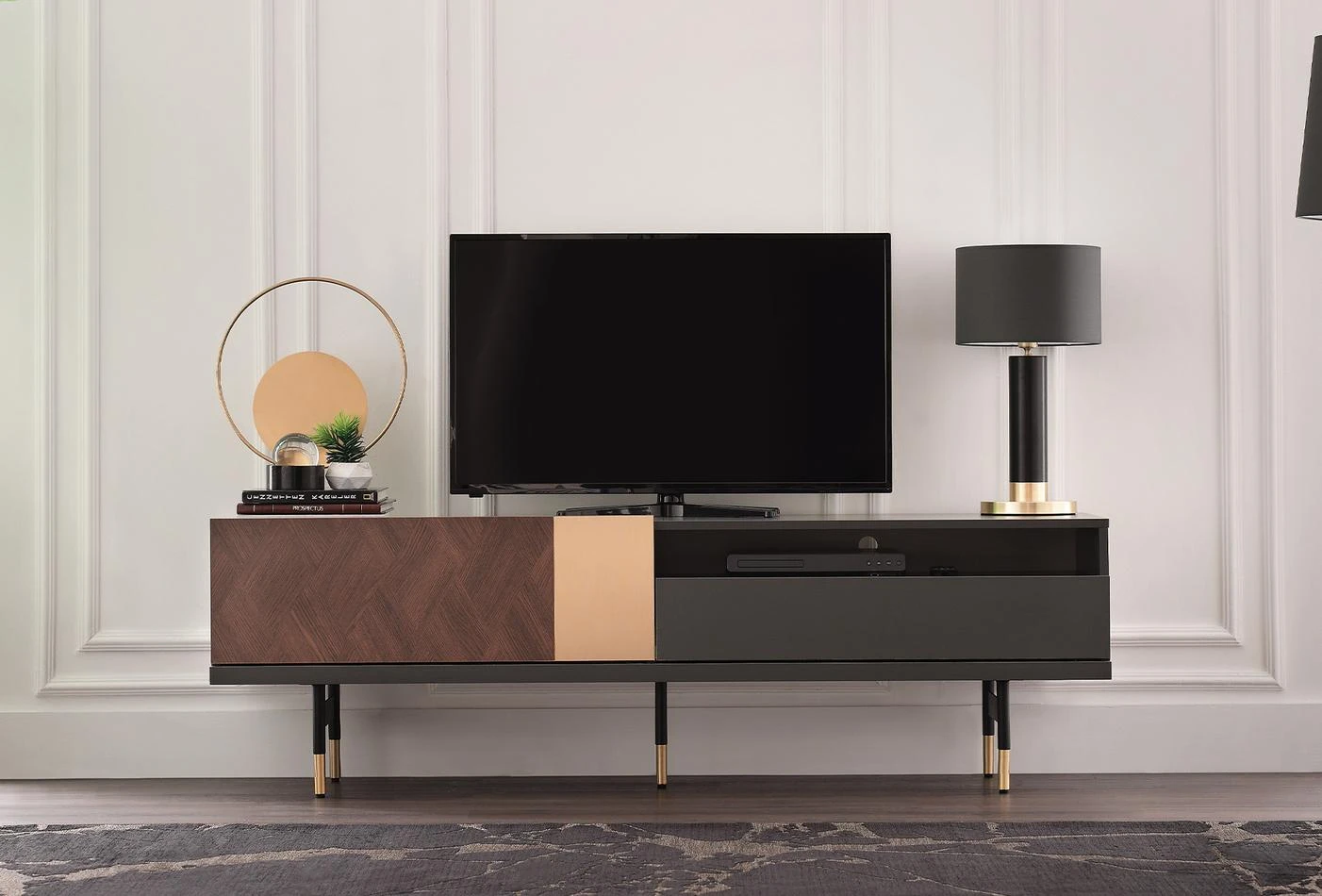 ست تلویزیونSONA با ترکیبی از رنگ‌های گردویی کمرنگ و قهوه‌ای متالیک با طراحی خاص دستگیره‌های برنزی و ...