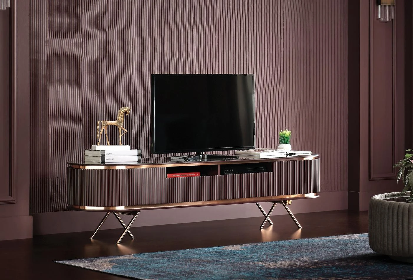 میز تلویزیون VIENNA با طراحی مدرن و خطوط منحنی به همراه نوار فلزی رزگلد که مختص این سری هست و همچنین ...